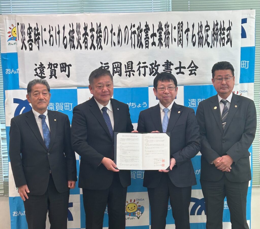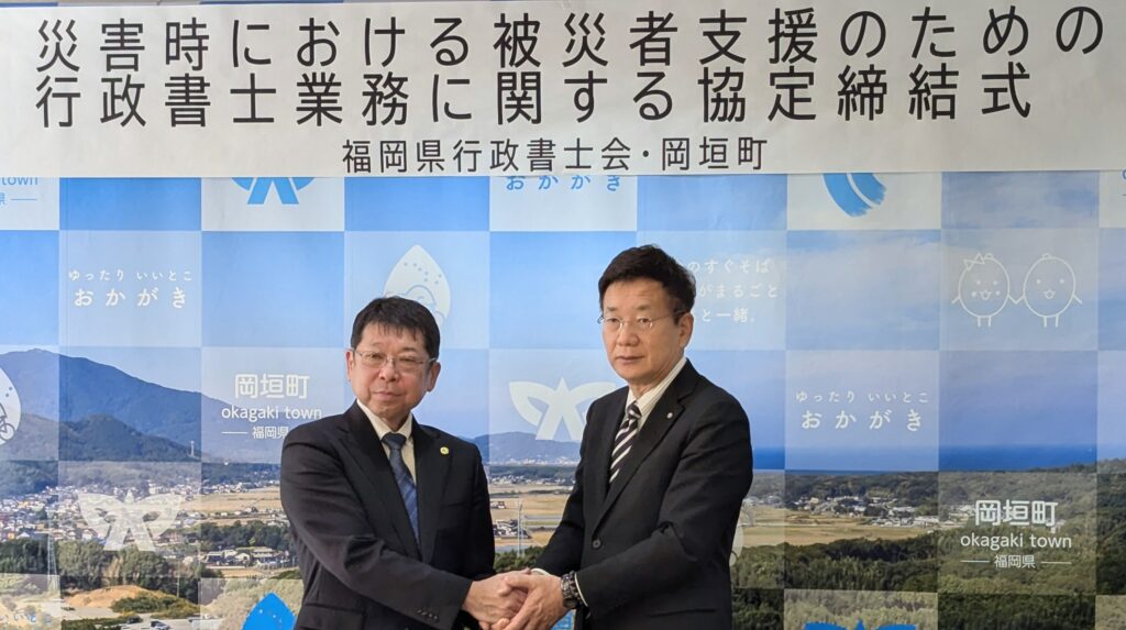新着情報 ホーム 新着情報 中間市、岡垣町及び遠賀町の3市町と防災協定を締結しました。 2026.02.24 中間市、岡垣町及び遠賀町の3市町と防災協定を締結しました。 次のとおり、福岡県行政書士会との間で「災害時における被災者支援のための行政書士業務に関する協定」を締結しました。 岡垣町 令和8年1月30日 中間市 令和8年2月5日 遠賀町 令和8年2月19日 本協定により、災害時における行政手続きの円滑な実施が図られるとともに、被災者の負担が軽減されることが期待されています。 一覧へ戻る